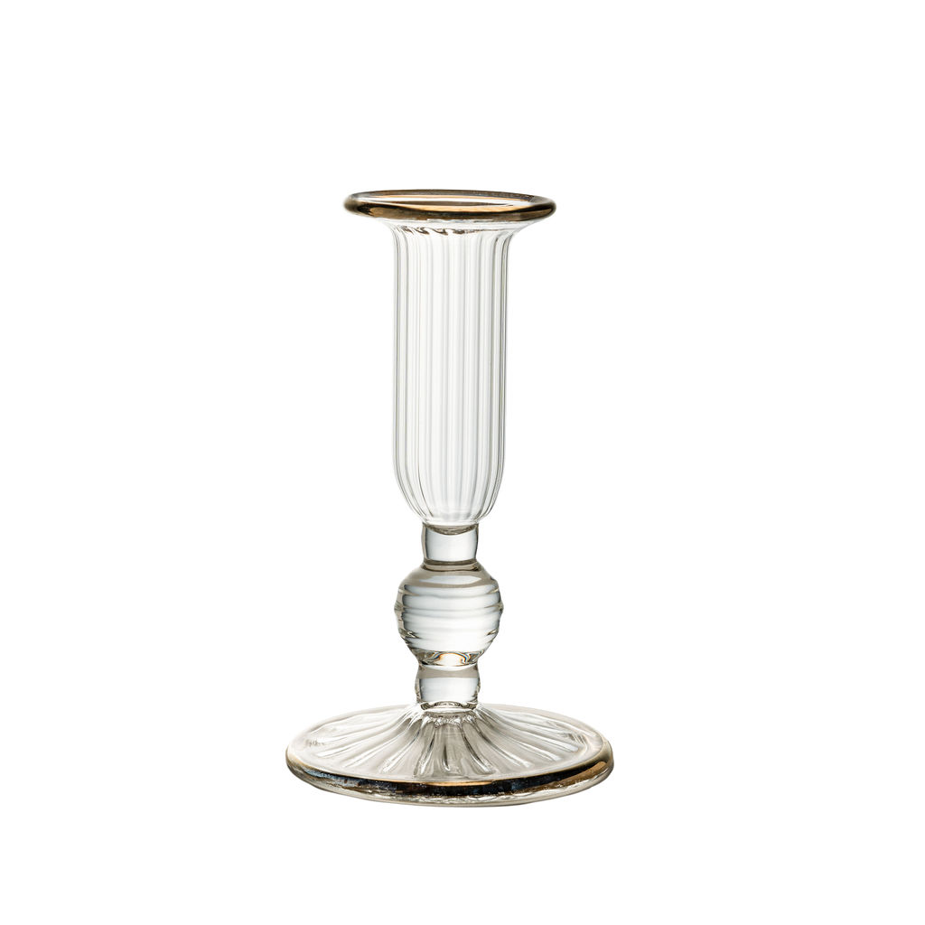 A low-waisted, elegantly hand-blown glass candle holder that features classic fluting. With a gold-rimmed base and top, and incised detail around the lower third, this candlestick is perfectly designed to scintillate across any dinner table.